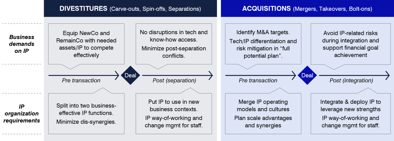 Acquisitions and divestitures – whether adding new capabilities or carving out parts of the business – are powerful tools for corporate growth and transformation, marking critical moments in a company’s evolution. However, as many companies have learned, they come with risk. Poorly executed transactions can lead to operational disruption, loss of critical assets and capabilities, and long-term strategic misalignment. Intellectual property (IP) is an important but often overlooked factor in determining whether major corporate restructurings succeed or fall short.