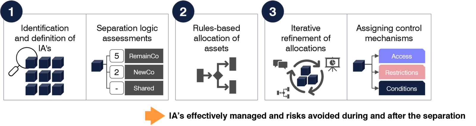 The process followed three main steps: 1) Identification and definition of IA's, including separation assessment, 2) Rule-based allocation of assets between NewCo and RemainCo, and 3) Iterative refinement of allocations and assigning control mechanisms to manage assets during and after the separation.