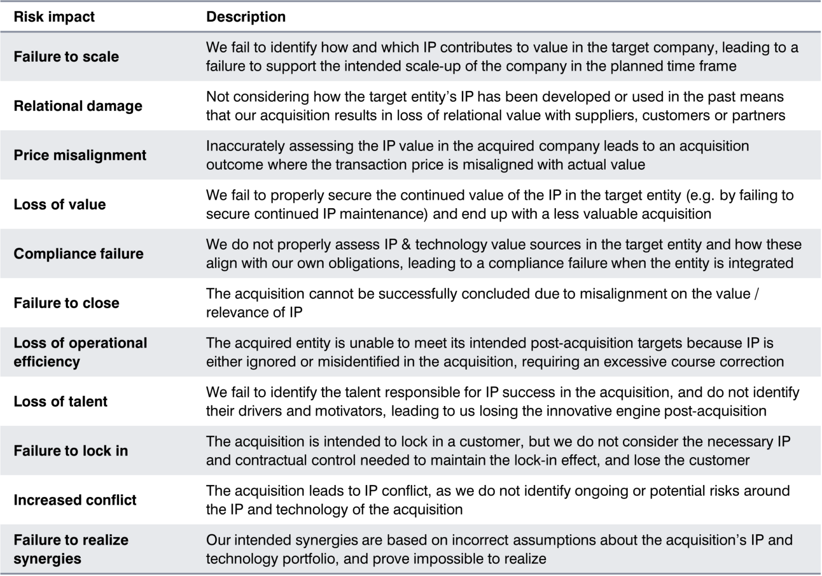 - Building an overview of common risks: To underline the need for change, an overview of typical risks from failing to consider IP appropriately in acquisitions was put together with real-world examples. Interviews were carried out with CTO’s, acquisition managers, and business heads to scope the problem and develop a case library of IP risks encountered in actual acquisitions.
