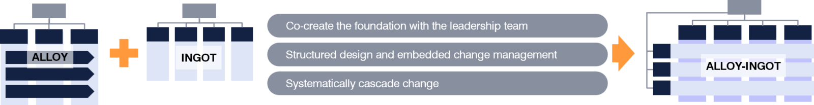 Starting at Day 1, the two IP organizations of ALLOY and INGOT had 100 days to move from an interim solution where they worked side-by-side to a new unified IP operating model. To successfully deliver on this, an integration team was formed. This team, composed of selected members from both legacy organizations followed three key principles in their work: co-creating the foundation with the leadership team, embedding change management into the integration process, and systematically cascading the transformation across the organization.