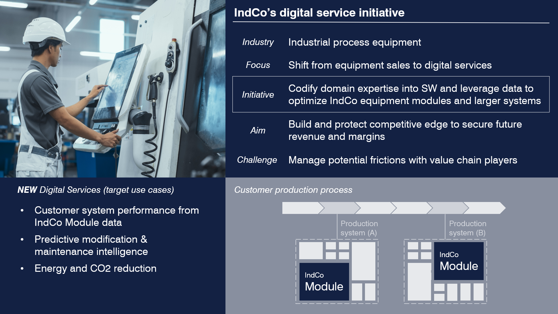 To stay ahead, ‘IndCo’ realized they needed to redefine their competitive approach. With margins under pressure and digitally savvy new players moving fast, traditional competitive moats could vanish overnight. It was no longer sufficient to rely on established business models and innovation focused on product-plus-aftermarket-services. The company set out to reshape its strategy, revisiting its commercial objectives, go-to-market model and product portfolio, with focus on differentiation through technology and data.