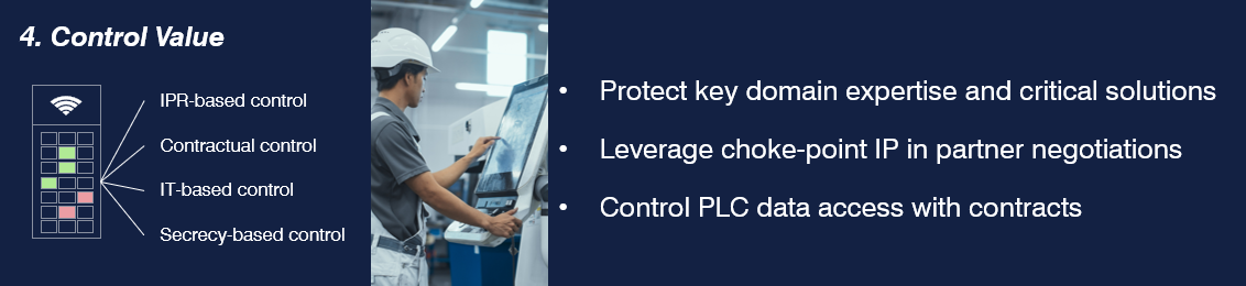 The final step in the iterative strategy development process is Control Value. Building on the Tech & Data Map, this step focuses on planning how to establish and leverage IP control points, including intellectual property rights such as patents, IT-based controls, secrecy, and contractual mechanisms, to strengthen differentiation and mitigate risk.