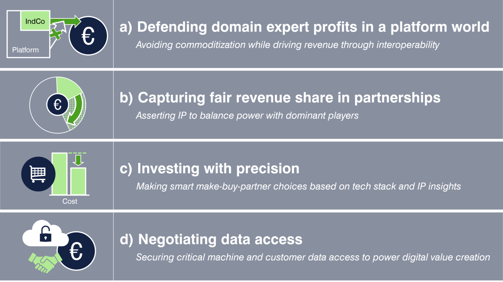 Importantly, IndCo did not just build IP portfolios. It also planned and prepared how to use them strategically. The results were tangible, as demonstrated in the four competitive situations—for example, securing a more favorable revenue split with a major software partner through patent-backed positioning, and gaining access to valuable operational data through negotiations with machine manufacturers.