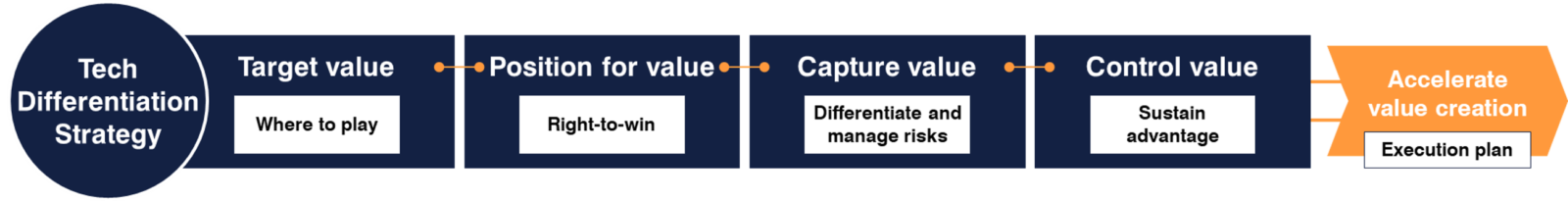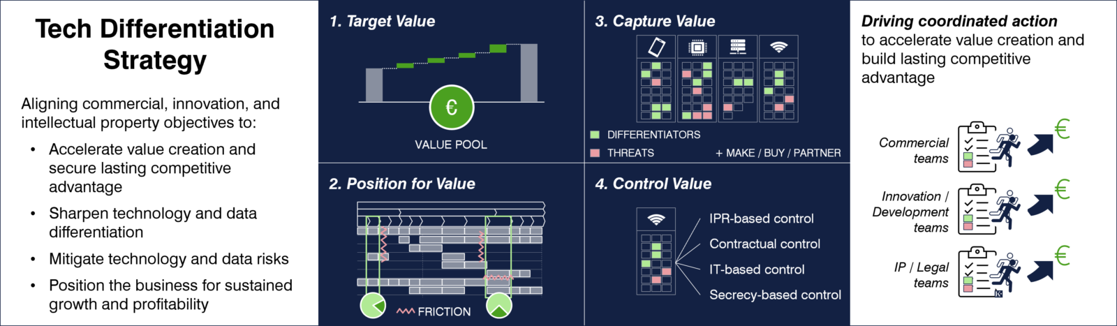The Target-Position-Capture-Control Value approach underpinned every real engagement that inspired the synthetic IndCo narrative. In each case, the Tech Differentiation Strategy gave leadership a shared strategic canvas, a common vocabulary and granular insight into technology, data and intellectual property. This alignment enabled coordinated and deliberate action to deliver the wanted results: